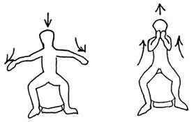 病人直坐立於球之上方,雙手掌心互對於下巴前,兩手臂呈水平。 吐氣時由一邊之坐骨粗隆將球帶至球之最高點,另一邊騰空。 吸氣時推至原位。 重複向另一端推(如右) |